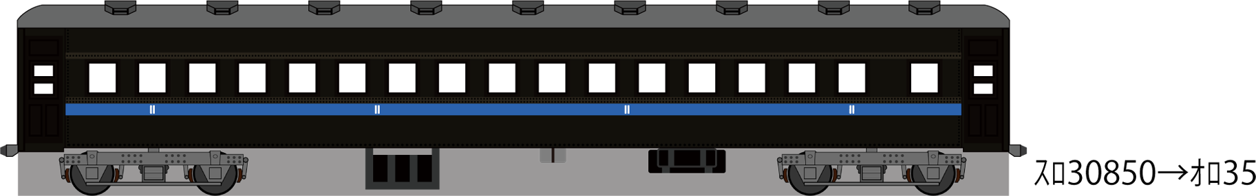 オロ35は、スロ30850として昭和9年から16年にかけて70両が製造されました。定員64名で車内には転換式クロスシートを装備していました。スロ30800(スロ32)と同様、側窓が等間隔で並ぶ端正な外見です。しかし技術の進歩を反映し、リベットが少ない(又はない)、丸屋根であるといった差異があります。
